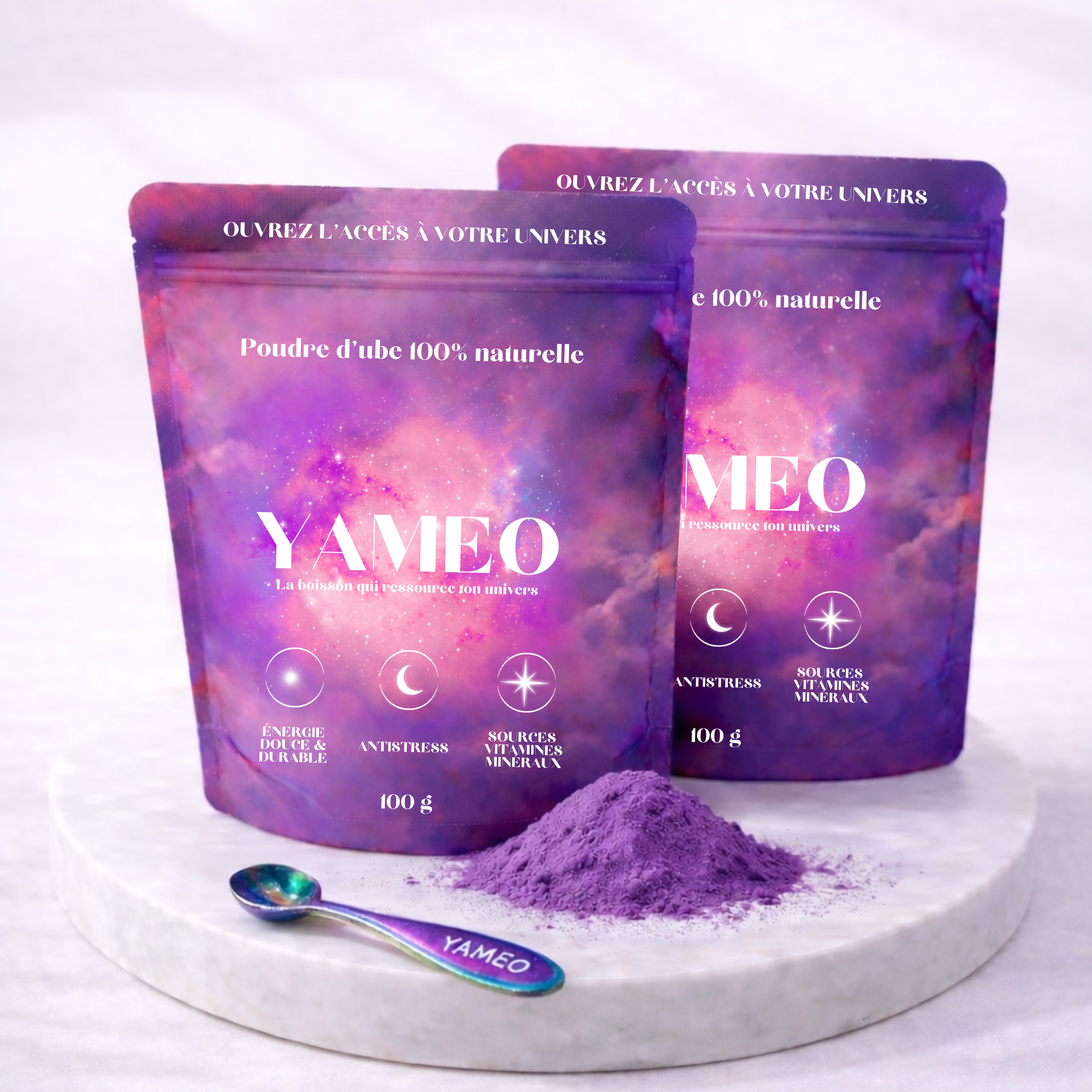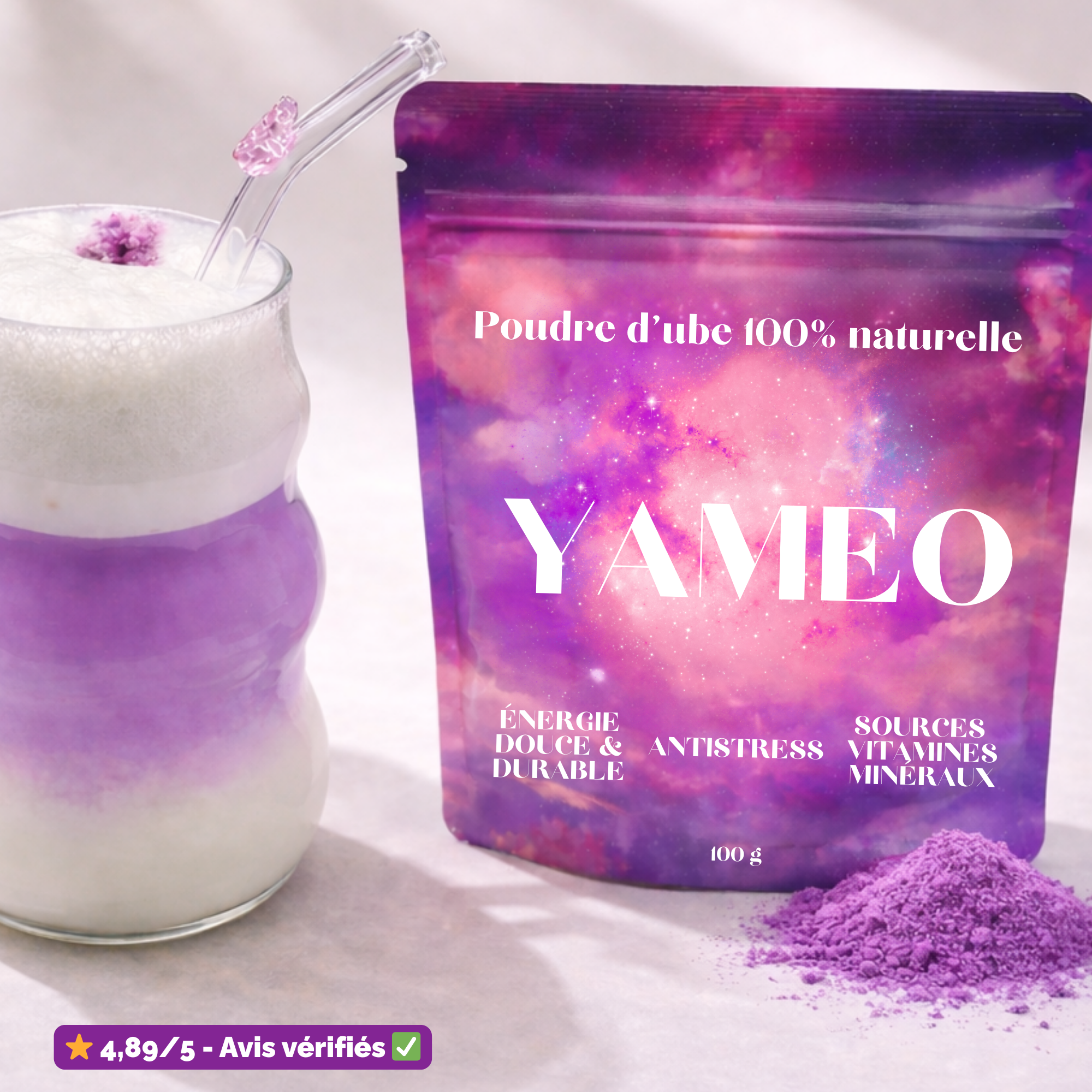 L’ube est une racine violette originaire d’Asie du Sud-Est, aussi appelée igname violette. Traditionnellement utilisée dans de nombreuses recettes asiatiques, elle est appréciée pour sa couleur naturelle intense et son goût doux, légèrement sucré. Chez Yameo, nous utilisons une poudre d’ube 100% pure, sans sucre ajouté, sans additifs ni colorants.