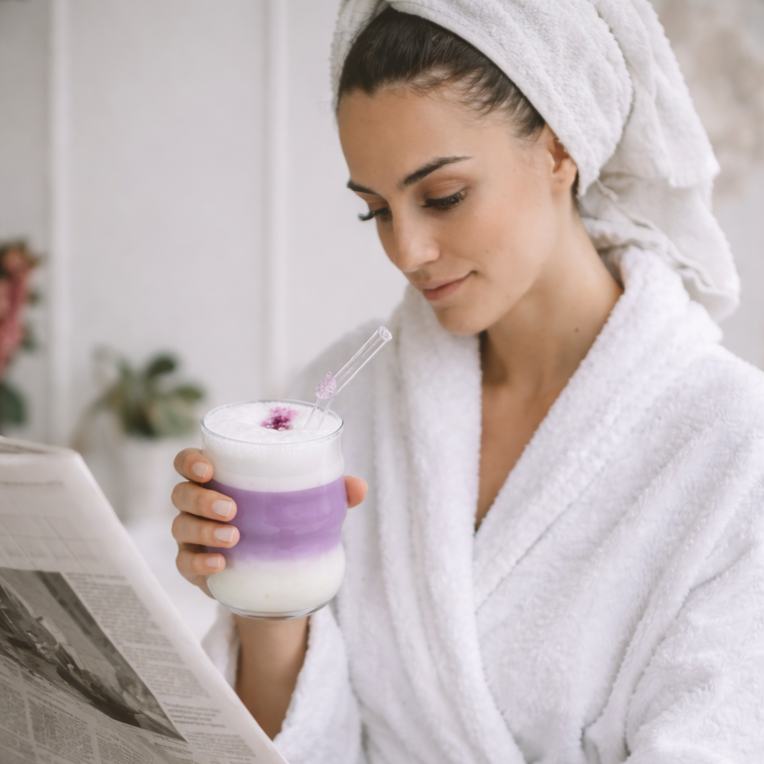 Un latte violet, doux et réconfortant. Un moment à soi, simple à préparer. Un geste quotidien qui transforme vos matins en pause apaisante.